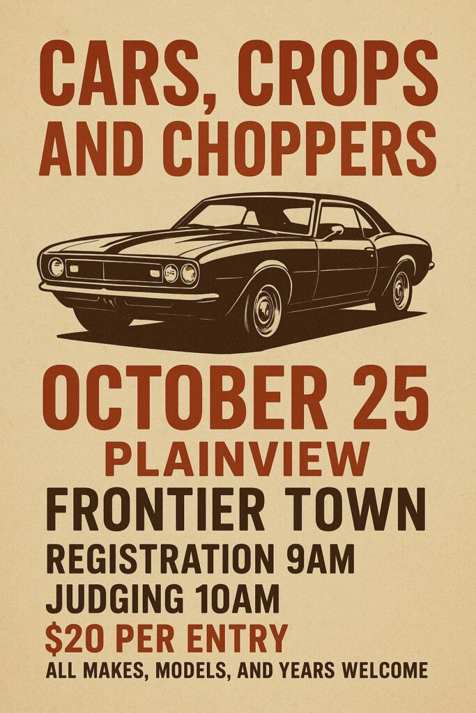 Get ready, Plainview! Plainview Free Will Baptist Church is bringing back the ultimate showcase of wheels at Cars, Crops & Choppers on Saturday, October 25th at Frontier Town.