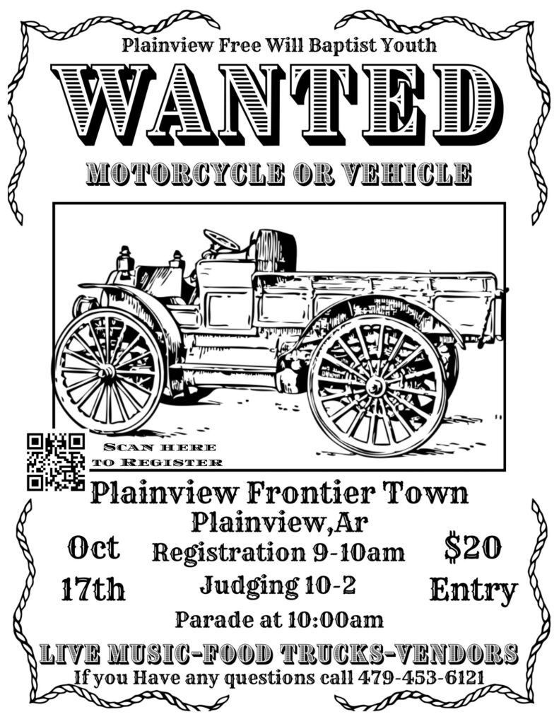 Get ready, Plainview! Plainview Free Will Baptist Church is bringing back the ultimate showcase of wheels at Cars, Crops & Choppers on Saturday, October 17th at Frontier Town.